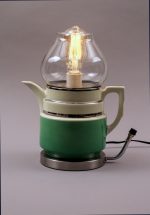 This wall sconce was created from 2 metal globes, originally part of a ceiling fan. The gloves were joined end to end and mounted to a lid from a stainless steel saucepan. Warm white light, both top and bottom, is provided by 2 GU-10 LED bulbs. - "A Collection of Dreams," at the Price-Campbell Foundation Gallery, Annette Howell Turner Center for the Arts, Valdosta GA