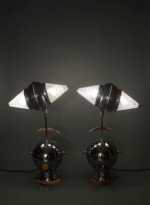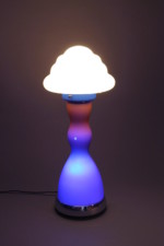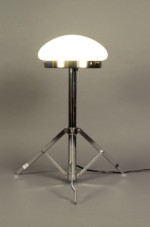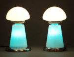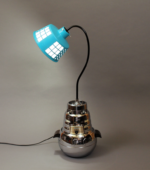 A desk/table lamp, featuring a round stainless steel base, approx 5” diameter. Body is a vintage mid-century modern styled frosted glass ceiling pendant lamp shade, with painted abstract designs . It is topped off with a frosted flat globe. The lamp features a blue LED bulb in its body, and a white LED bulb on top.