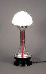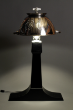 A Bauhaus School inspired desk/table lamp, with a few elements that stand out. It begins with a gloss black conical base. The body is an inverted glass pendant lamp reflector, mounted on a chrome tube. The half-spherical metal shade is painted a gloss white. The Yen and Yang are joined by the warm golden light coming from the glass body.