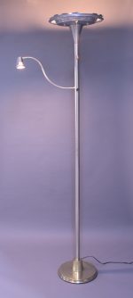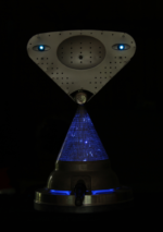 This lamp springs from imagining the Enterprise from Star Trek. The body is a vintage cast aluminum 3-light ceiling fixture (1920s-30s), turned upside down and mounted on a desk lamp base. The white globe on top in front is balanced by the 2 “warp engines” in back.
