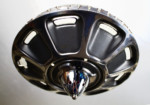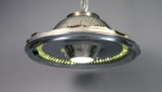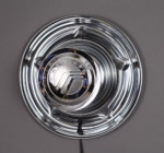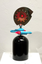 This UFO was created from upcycled automotive, kitchen and audio components, The underside of the body started out as a metal hubcap with top of the body sourced from a large metal speaker frame. The Flying Saucer sits on a conical vertical riser and a chrome round base, which started out as a lid to some kind of pot. Blue LED light bulbs Mounted inside the UFO shine through white styrene “windows” that have flexible wire electronics shielding stretched and adhered to each one. Openings in the bottom wheel cover are covered with styrene bonded to blue fabric.