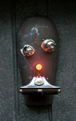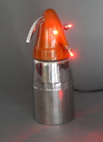 A retro-styled Rocket Ship desk/table lamp. The base likely came from a desk lamp. The body is from a repurposed vintage mid 20th century coffee maker. A bullet-shaped clear bubbled glass dome rests on an inverted desk lamp base, mounted on top of the lamp body. This lamp features a red mini LED at bottom, and a red LED bulb in the top dome.
