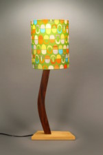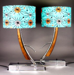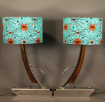 The base of this retro table/desk lamp was repurposed fromAnother table lamp. It’s beautiful teardrop shape leads the eye right to the custom handmade shade, featuring Michael Miller designed and mid-century modern themed “Atomic Cats” fabric.