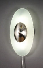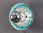 Sconce made from recycled materials, including a 10” circular saw blade and a rounded reflector from a desk lamp.