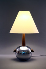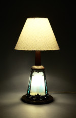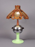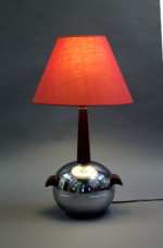 This table lamp started out from some kind of “Lazy Susan” style wooden turntable, for some unknown purpose. It is supported by a wood furniture leg, mounted on a turned wood base. A domed-shaped white frosted globe is mounted on top, directly to a cavity in the turntable.