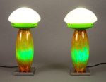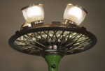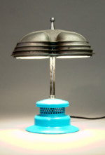 This unique table/desk lamp was created out of a non-working vintage Emerson Electric desk fan, from the 1940s. It features a warm white light, provided by 3 LED tubular Edison-style bulbs where the fan blades used to be. In addition to the main lights, a blue light shines through vent holes in the front of the motor housing. The lighting is controlled from the original fan switch, allowing for white lights only, blue lights only, or both at once. Artisans Guild Gallery sale.