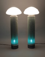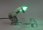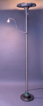 A desk/table lamp, with a body repurposed from a ceiling pendant fixture reflector. A half round frosted white globe from another ceiling fixture adorns the top. When lit, the lamp base gives off a cool green glow, while the soft white light from the top provides illumination for reading or just admiring. Approximate dimensions: 17” x 7” x 7”.