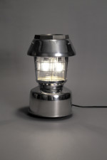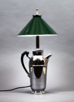 The body of this unique and fun mood/accent lamp was repurposed from a stainless steel mid-century modern styled ice bucket. The sleek modern look is completed by the bullet-shaped frosted glass dome that seamlessly connects to the body. A warm light from an LED bulb provides pleasing illumination. - Sold at Artisans Guild Gallery, Gainesville FL.