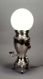 This desk/table lamp features a seafoam blue-painted body created with an upcycled stainless steel commercial drip coffee maker, as seen so often in diners. A bicycle racing-style handlebar is mounted on top of the inverted drip coffee maker. Red LED lights emerge from both ends of the bars, and a round frosted white globe is mounted on top, in the center, with a warm white glow from an LED bulb. Approximate dimensions - 20” h x 17” w x 10” d.