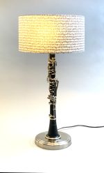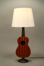 This unique desk/table lamp features a body from a vintage guitar neck. It rests within a block of cedar and sits on a square metal base. A rotary on/off switch comes through the rosewood fingerboard. A double-curved lamp pipe comes up behind the guitar neck, and comes through the headstock. Six pearl dots fill the holes where the tuning machine posts were, and three more are on the fingerboard. The entire lamp was given a glossy lacquer finish – black for all, except the fingerboard, which was left natural. The lamp has a handmade cloth shade with a musical-themed print. Warm white illumination is provided by two LED bulbs.