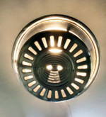 A repurposed stainless steel steamer (asparagus?) - has provided a great way to add blue accent lighting. Topped with a recycled round frosted white glass globe.